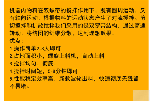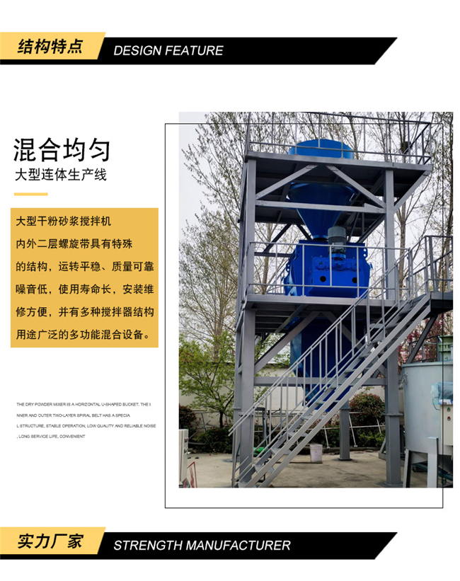 混合系統(tǒng):可配套雙軸無(wú)重力漿葉式混合機(jī)、犁刀混合機(jī)混合機(jī),具有混合速度快、混合精度高等優(yōu)點(diǎn),該機(jī)可攪拌1:10,00甚至更高的極限混合比。在攪拌漿葉合理的推動(dòng)速度下,使聚苯顆粒、膠凝材料和化學(xué)添加劑等比重、粒度差異較大的物料,處于瞬間失重狀態(tài),在拌筒內(nèi)形成全方位對(duì)流、擴(kuò)散和相互剪切,快速溫和地達(dá)到混合均勻的效果,不會(huì)產(chǎn)生偏析和破壞物料的原始狀態(tài),確保了砂漿的保溫系數(shù)不會(huì)因保溫原料的形狀破壞而降低,確保了產(chǎn)品的保溫效果。